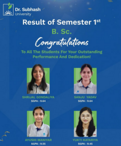 The outstanding results of Semester 1 B.Sc. students mark the beginning of a promising academic journey. Their achievements are not only a source of pride for their families and mentors but also a reflection of the vibrant learning environment at Dr. Subhash University.