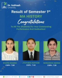 The success of our MA History Semester 1 achievers is a proud moment for the entire academic community at Dr. Subhash University, the best private university in Gujarat. Their hard work and perseverance demonstrate the strength of postgraduate education and the importance of historical scholarship in today’s evolving world.