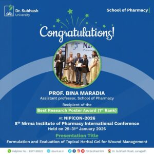 The School of Pharmacy at Dr. Subhash University continues to emerge as a center of excellence in pharmaceutical education, research, and professional development. Prof. Maradia’s success serves as an inspiration for students, young researchers, and fellow faculty members to pursue meaningful research and aim for global recognition.