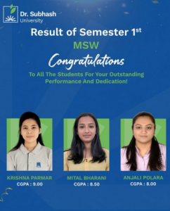The Master of Social Work (MSW) program is designed to shape socially responsible professionals who are equipped to address complex social challenges. Excelling in the very first semester of this program demonstrates strong determination, disciplined study habits, and a genuine desire to contribute positively to communities. Your achievement fills the entire university with pride and reinforces the values upheld at Dr. Subhash University, the best private university in Gujarat.